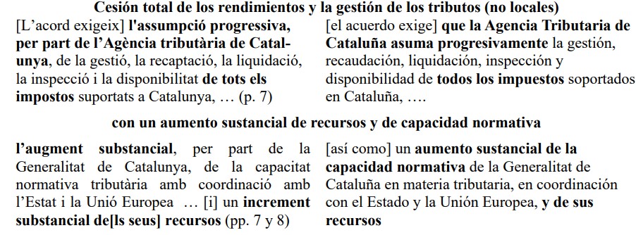 Para Fedea, "la parte más clara de la propuesta tiene que ver con la gradual cesión a la Generalitat de todas las competencias del Estado en materia de gestión tributaria, que se pretende total y sin matices, así como de los medios materiales y personales necesarios a tal efecto (los de la Agencia Tributaria estatal en Cataluña) y de la titularidad en primera instancia de los rendimientos de los tributos estatales, que deberá traducirse en un incremento sustancial de los recursos de la Generalitat". Así, lo contempla también el acuerdo publicado hace 6 semanas.