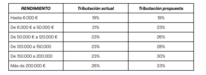 Díaz también quiere elevar el IRPF a las rentas del capital "para que las rentas del trabajo y las rentas del capital caminen hacia un acercamiento" aseguró. Después del discurso de Sánchez contra los Lamborghinis y "los que tienen suficiente dinero en el banco como para vivir 100 días", cabe esperar que daría su aprobación a esta medida que subiría los impuestos a las rentas del capital a partir de los 6.000 euros. En la tabla se observan los detalles.