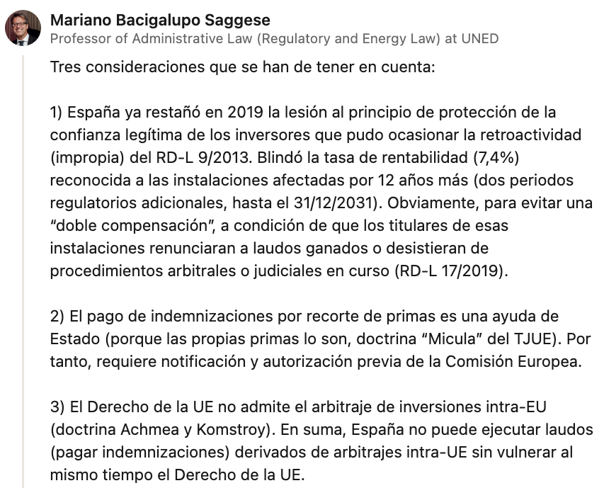 Este pronunciamiento ha generado una gran sorpresa, puesto que España se juega más de 1.880 millones de euros en la cuestión de los laudos renovables y el pronunciamiento de Bacigalupo tiene difícil encaje con el papel independiente que cualquier inversor espera de un integrante de la CNMV.