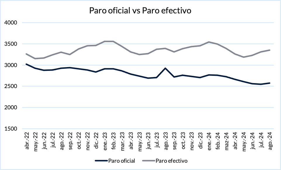 Este enfoque pone de relieve la incidencia del maquillaje estadístico introducido por la contrarreforma laboral de Díaz. Así, en agosto de 2024 había en España un dato oficial de 2.572.000 parados, frente a un desempleo efectivo que alcanzaba a 3.354 personas.