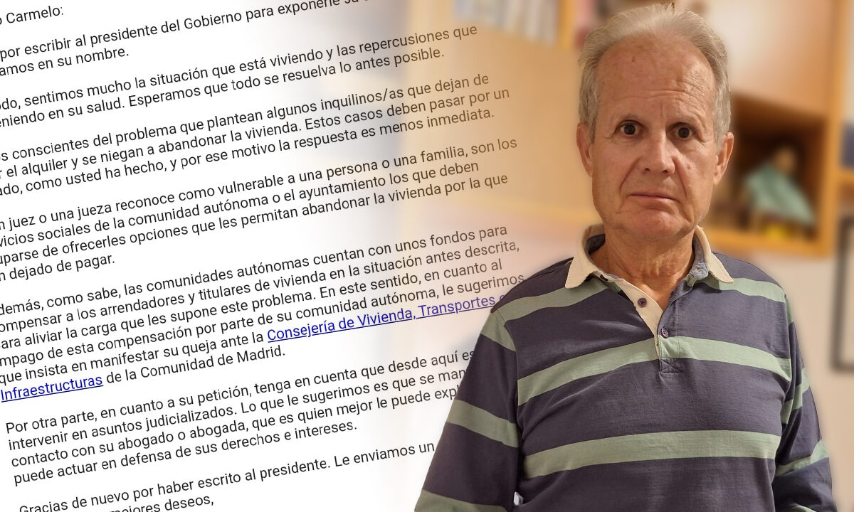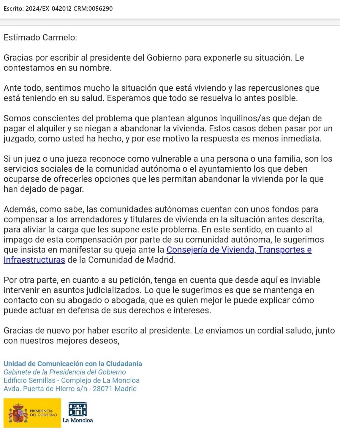 Para sorpresa de Carmelo, la respuesta no tardaba en llegar. Sin embargo, tal y como denuncia, lo único que hace el presidente es echar balones fuera y culpar a otras administraciones. "Somos conscientes del problema que plantean algunos inquilinos/as que dejan de pagar el alquiler y se niegan a abandonar la vivienda. Estos casos deben pasar por un juzgado, como usted ha hecho, y por ese motivo la respuesta es menos inmediata", arranca la misiva, que hace oídos sordos a la petición de derogar la norma que ha condenado a miles de propietarios de toda España a mantener a sus inquiokupas.