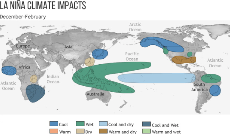 Durante el fenómeno de La Niña, el océano Pacífico tropical es más frío que el promedio, lo que desencadena una serie de posibles impactos, desde lluvias más intensas en Asia ( dónde mejora las perspectivas para el arroz, azúcar y aceites alimentarios) hasta condiciones más secas en América del Sur ( afectará a la producción de soja, maíz y azúcar) .