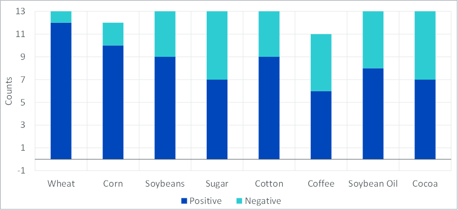 Además, la confianza en los productos agrícolas sigue siendo baja. El posicionamiento especulativo neto en trigo, maíz, soja, azúcar, algodón y aceite de soja está muy por debajo de su respectivo promedio de cinco años.