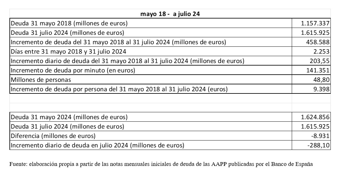 La deuda supera los 1,6 billones de euros y se sitúa en julio en 1,615925 billones de euros de endeudamiento, con 458.000 millones de euros de incremento desde que gobierna Sánchez (458.588 millones), según las notas iniciales de deuda de las AAPP emitidas por el Banco de España con carácter mensual.