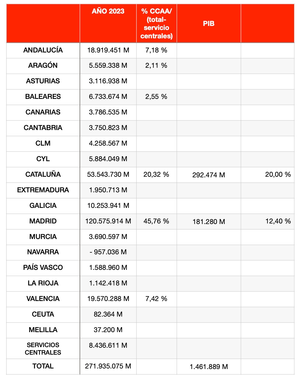 El total de recaudación nacional asciende a 271.935 millones. Y Madrid aporta nada menos que casi el 45% del total —sin correcciones técnicas el 44%, con las correcciones del sistema, aún más, el 45,76%—. Más del doble que el 20% de Cataluña. Por lo tanto, es radicalmente falso, bulo y fango -siguiendo los términos preferidos de Sánchez- que Madrid sea insolidaria. De hecho, es el soporte de la solidaridad de toda España.