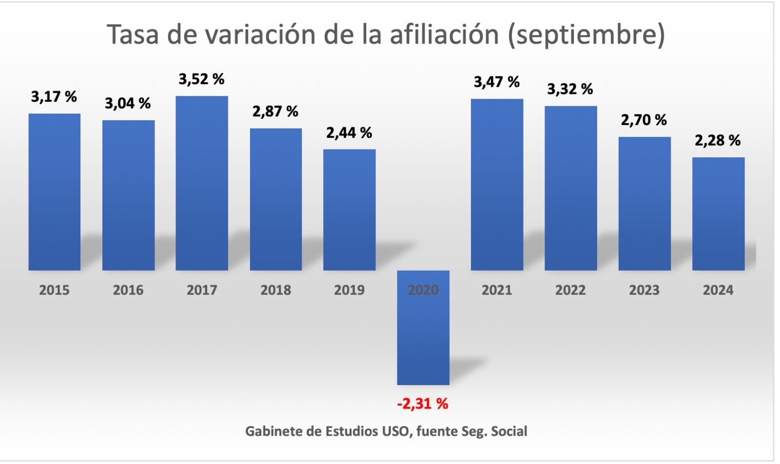 El resultado de todo ello es que, en estos momentos, la tasa de variación de la afiliación se sitúa en el 2,28% y en 2015 era del 3,17%. Es más, en 2021 —en plena llegada de ayudas covid y con todo el efecto escalón estadístico, obvio, con respecto al año 2020 y la irrupción más brutal de la pandemia— la tasa llegó al 3,47%. Y el dato actual es el más bajo desde 2015, descontando el año 2020 con la explosión del covid.