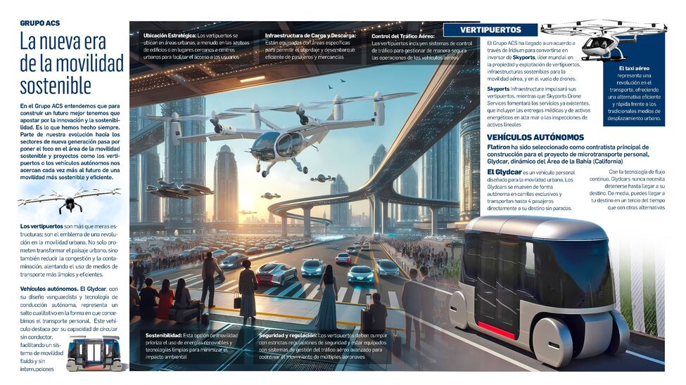 El nuevo enfoque de ACS en proyectos de nueva generación abarca cuatro áreas: biofarmacia/sanidad, digitalización, transición energética y movilidad sostenible. Dentro de este último ámbito, destacan proyectos como el desarrollo de drones y la creación de vertipuertos, así como iniciativas relacionadas con los Glydcars, vehículos diseñados para el transporte de pasajeros.