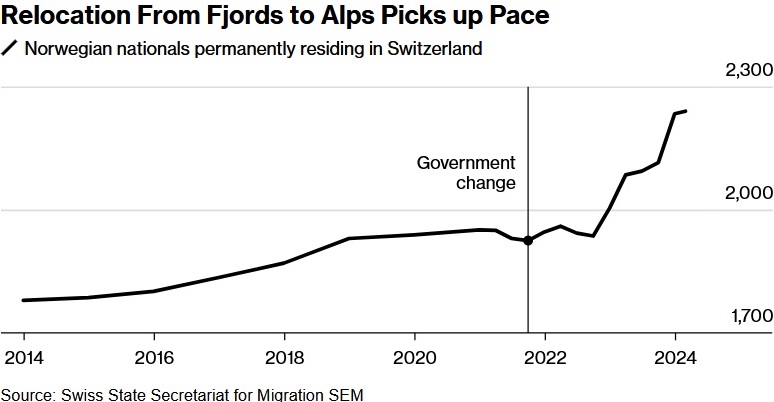 El siguiente gráfico refleja el punto de inflexión que supuso la llegada del nuevo gobierno de izquierdas y la activación de una política fiscal volcada en subir los impuestos a los ricos. Tal y como se puede ver, las migraciones de Noruega a Suiza se han disparado desde que entraron en vigor estas nuevas políticas socialistas: