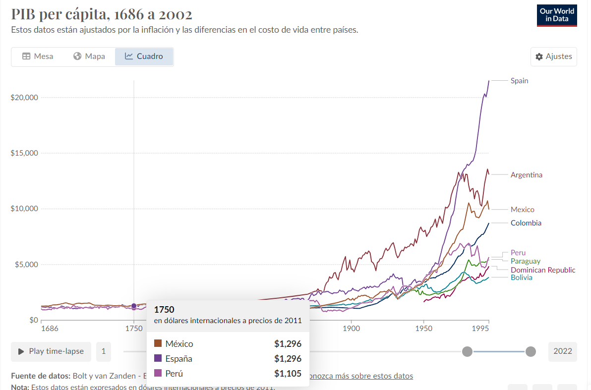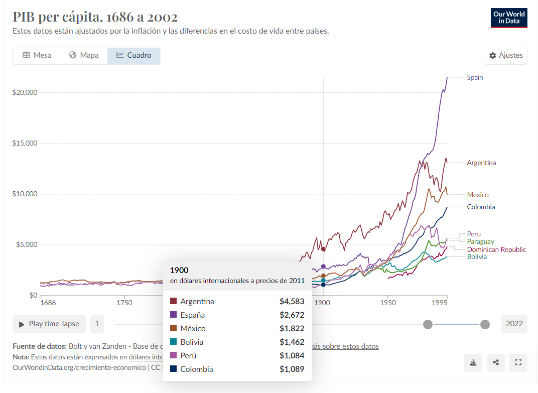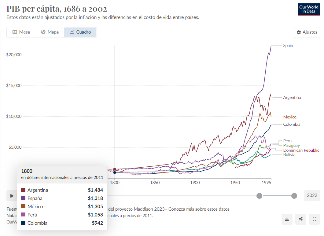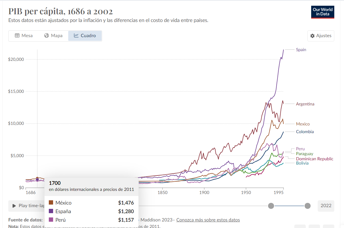 Si acudimos a "Our World in Data" y nos servimos de la base de datos del "Proyecto Maddison 2023" (cuyas estimaciones sobre el crecimiento económico y de población de cada país son las más importantes del mundo) y comparamos el PIB per cápita de España con el de algunos de los territorios como Argentina, Perú o México, es posible que nos llevemos alguna sorpresa, veamos: