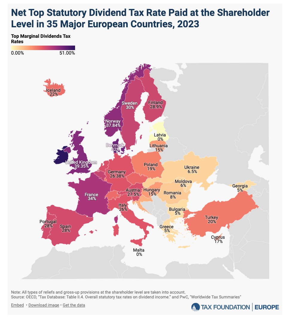 Asimismo, la tributación de los dividendos es inferior al 20% en Polonia (19%), Chipre (17%), Hungría (15%), Lituania (15%), Croacia (12%), Rumanía (8%), Eslovaquia (7%), Ucrania (6,5%), Moldavia (6%) o Bulgaria, Grecia y Georgia (5%). Como se apuntó anteriormente, ni Estonia, ni Letonia, ni Malta aplican impuestos al reparto de dividendos.