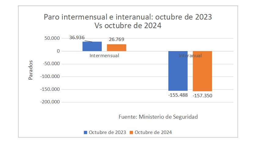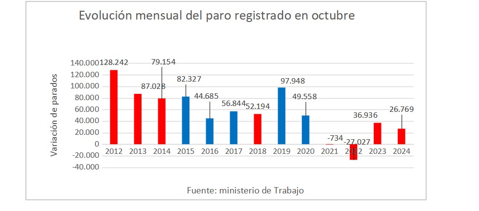 El paro sube en 26.769 personas. Por otra parte, en tasa interanual el paro baja en 157.350 personas, que es el cuarto peor dato interanual de un mes de octubre de los últimos doce años, con lo que la bajada no es especialmente destacable para este mes, hecho que muestra la ralentización interanual de la bajada del paro, comparando períodos homogéneos.