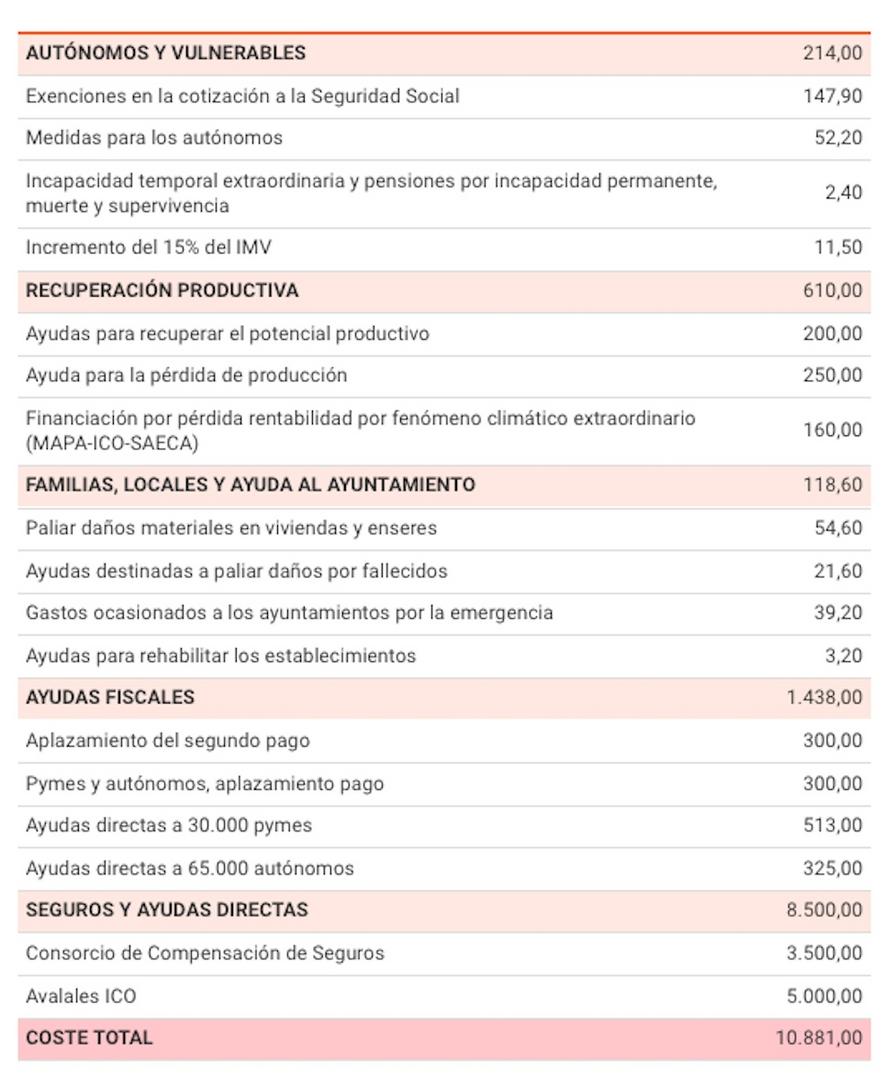 El "Estado va a transferir hasta 72.000 euros por casos de incapacidad; entre 20.000 y 60.000 euros para la reparación de las viviendas dañadas; hasta 10.300 euros para cambiar o reparar muebles, electrodomésticos y enseres, y hasta 37.000 euros para reparar elementos de las comunidades de vecinos, como portales o ascensores". Habrá "ayudas directas para las pymes y los trabajadores autónomos con domicilio fiscal en las zonas afectadas por la DANA, por un valor total de 838 millones de euros. Estas ayudas serán de 5.000 euros para los autónomos y oscilarán entre los 10.000 y los 150.000 euros para las empresas, en función de su volumen de operaciones", añade el plan.