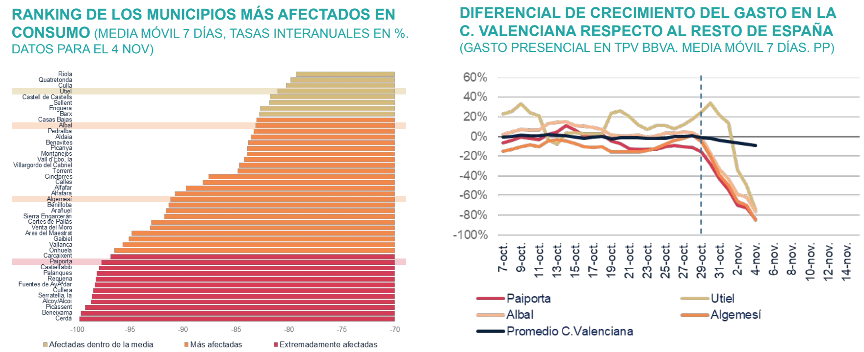En el conjunto de la Comunidad Valenciana, esta métrica revela un descenso del 20%, de modo que las consecuencias van más allá de la "zona cero" de la DANA, que se concentra en localidades como Paiporta o Catarroja.
