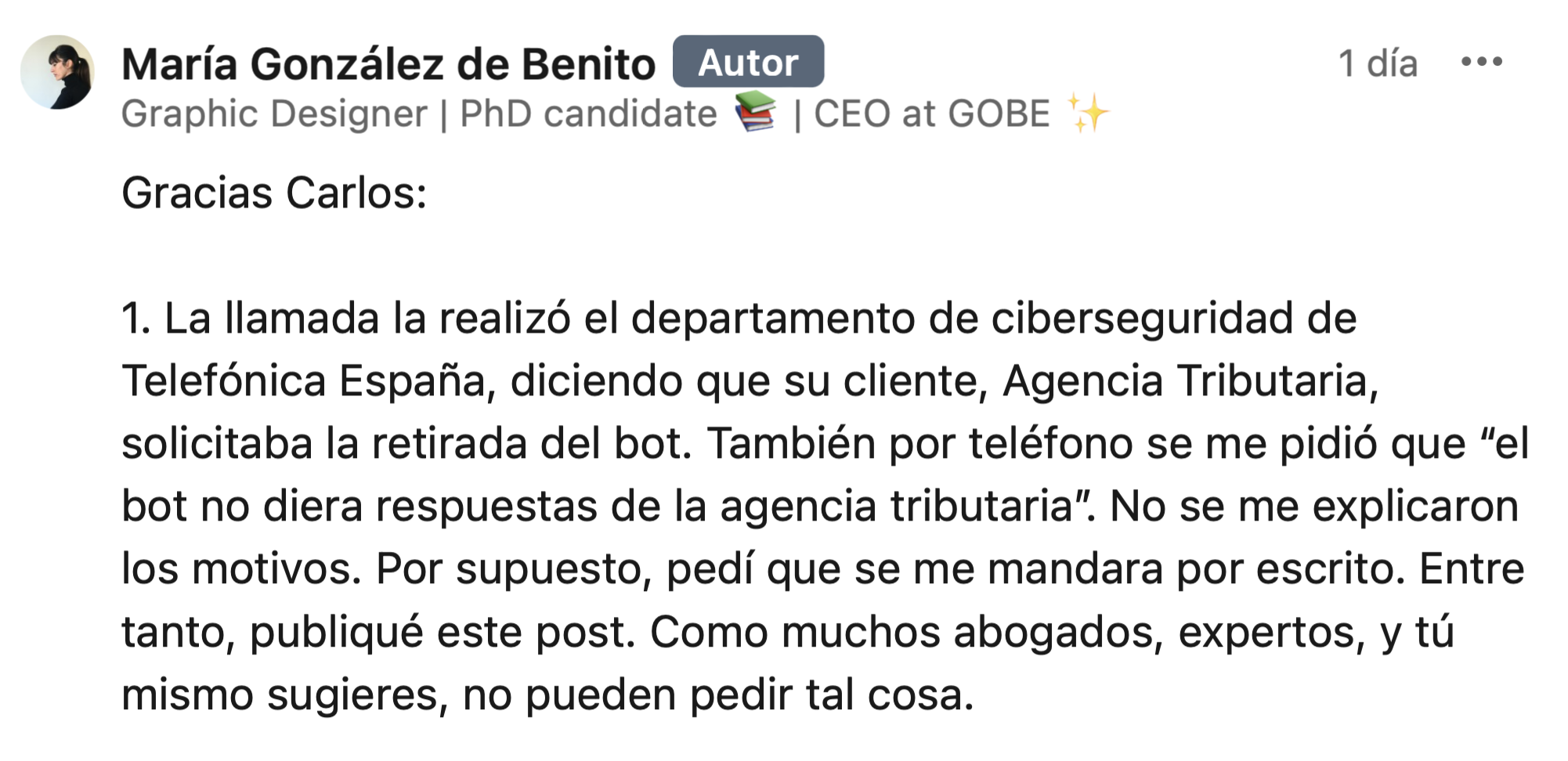 Según relata la diseñadora en su perfil de LinkedIn, recientemente recibió una llamada del departamento de ciberseguridad de Telefónica España, que, actuando en nombre de su cliente, la Agencia Tributaria, solicitó la retirada inmediata del bot. "No se alegaba ningún motivo", explicó González. Posteriormente, en un intercambio de correos electrónicos, se solicitó que realizara ciertos cambios en la herramienta, aunque nuevamente sin detallar razones concretas.