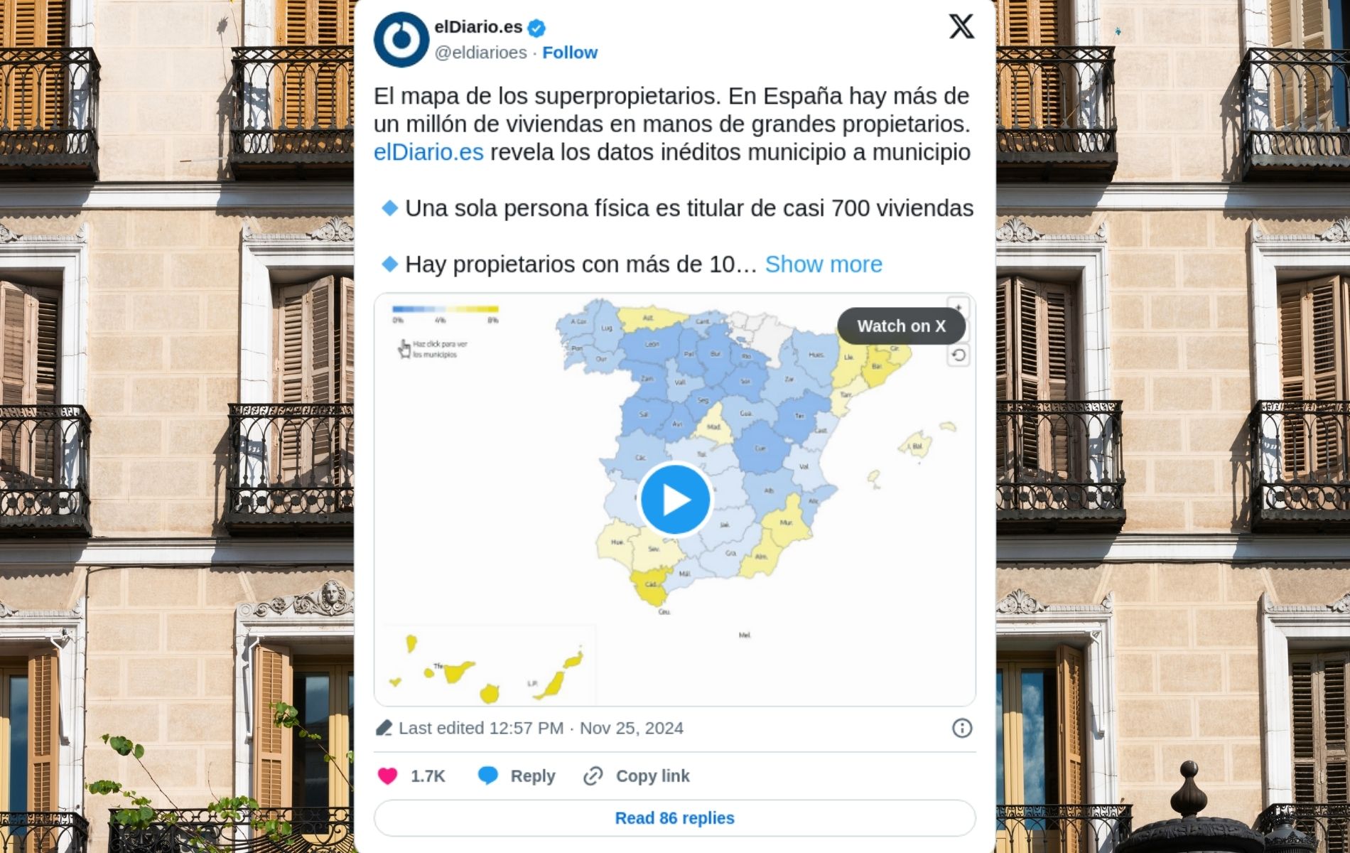 La publicación de un artículo de El Diario que analiza la distribución de viviendas en manos de grandes propietarios en España ha desatado a los usuarios en la red social X. En el artículo, se expone que más de un millón de viviendas en España pertenecen a grandes propietarios, definidos como aquellos con 10 o más inmuebles. Aunque esta cifra representa solo el 4,3% del parque total de viviendas, tal y como el propio medio anuncia al final del artículo, el tono alarmista en la presentación de los datos y el mapa interactivo incluido en su investigación ha provocado reacciones polarizadas.