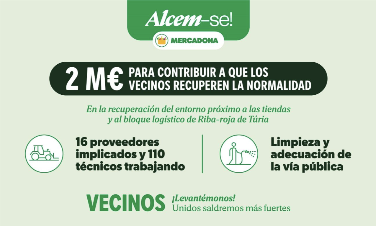 Mercadona, comprometida con todos los afectados por la DANA, invierte más de 2 millones de euros en la recuperación del entorno de sus tiendas y de su bloque logístico de Riba-roja de Túria que se han visto afectados por la catástrofe, con el objetivo de contribuir a que los vecinos recuperen la normalidad. La iniciativa, liderada por el departamento de Obras de la compañía, pone a disposición de los vecinos, con la autorización previa del ayuntamiento, la labor de limpieza y adecuación. En total, 16 proveedores que están dando empleo a más de 110 personas.