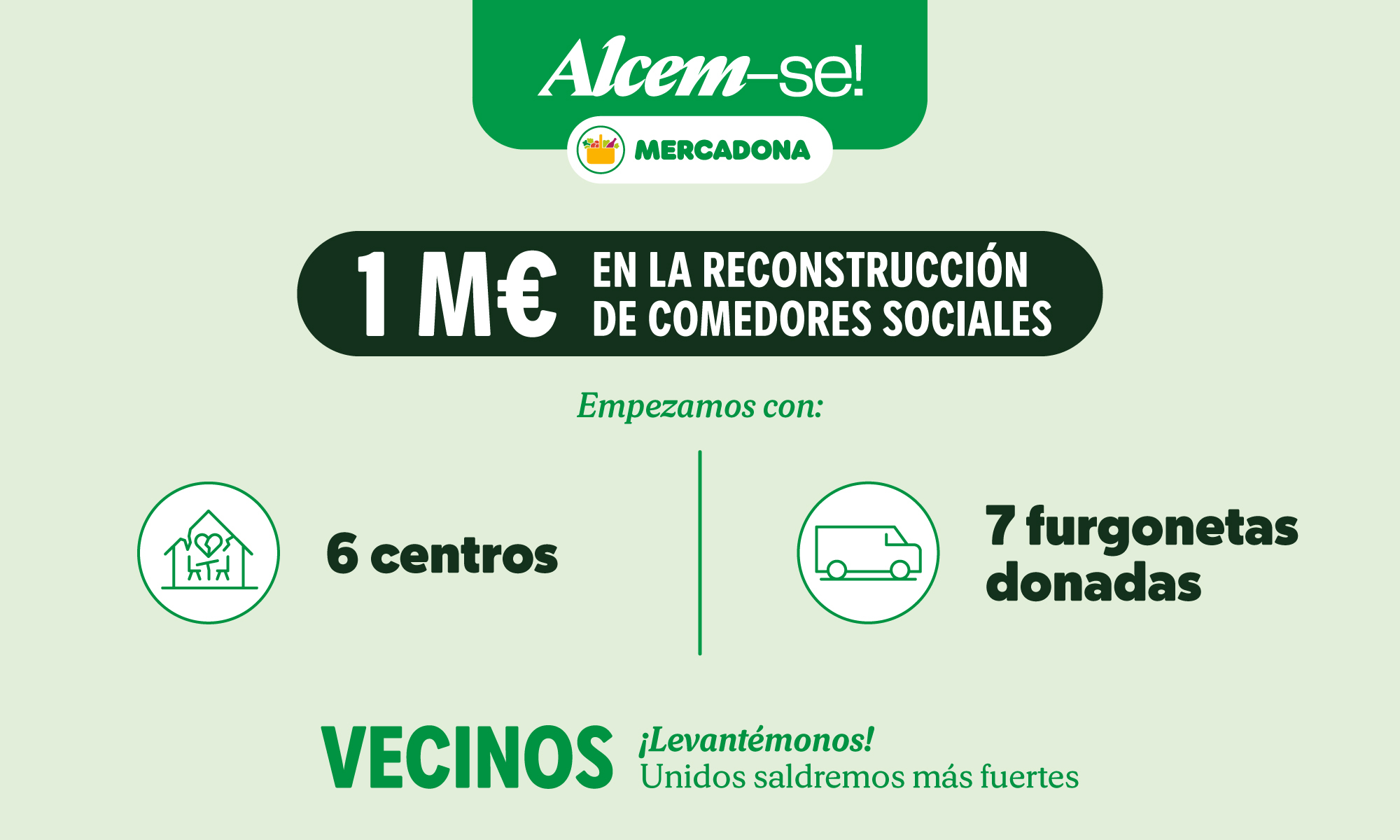 Mercadona, comprometida con todos los afectados por la DANA, destina 1 millón de euros a la reconstrucción de comedores sociales afectados por la DANA con los que la compañía mantiene colaboración habitual, con el objetivo de que estas entidades no partan de cero y puedan recuperar lo antes posible la gran labor que prestan atendiendo a personas en situación de vulnerabilidad.