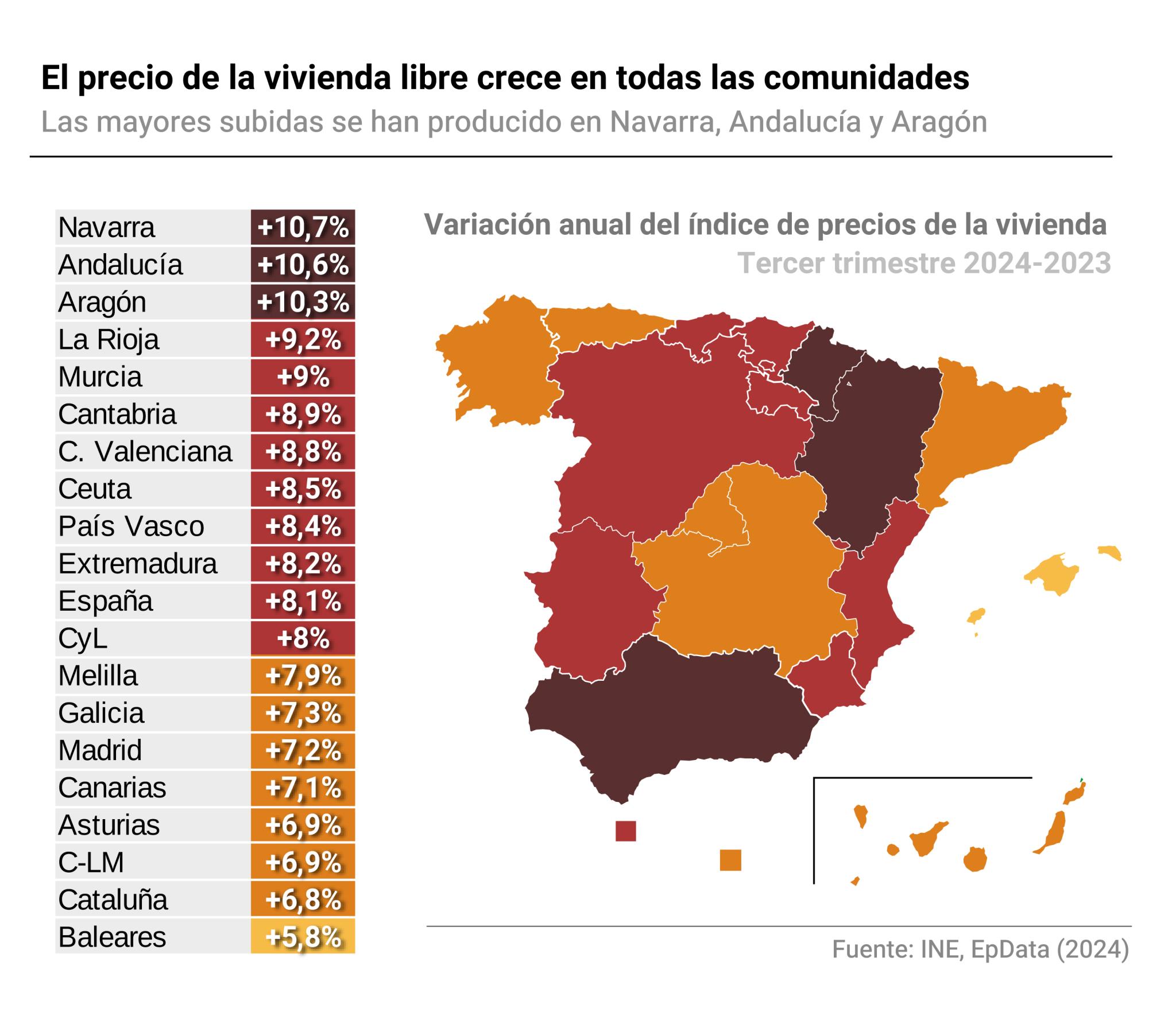 En cuanto al análisis por comunidades autónomas, Navarra lideró los incrementos con un avance del 10,7%, seguida de Andalucía (10,6%) y Aragón (10,3%). Otras regiones con subidas significativas fueron La Rioja (9,2%) y Murcia (9%). En el otro extremo, Baleares registró el incremento más moderado, con un 5,8%, seguida de Cataluña (6,8%) y Asturias y Castilla-La Mancha, ambas con un 6,9%.