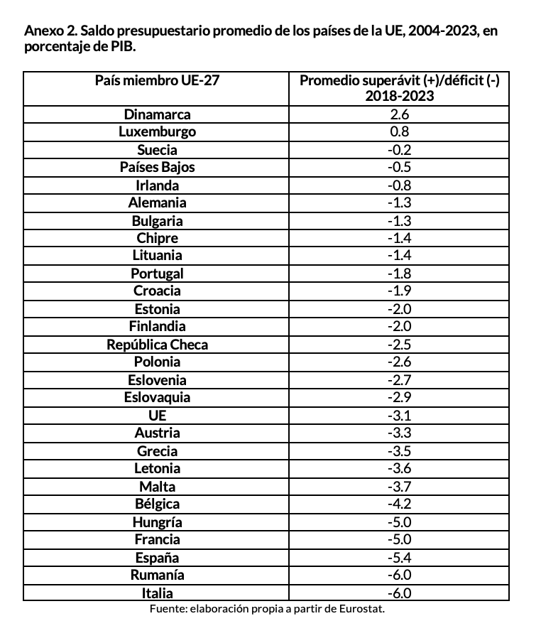 Entre 2018 y 2023, bajo gobierno de Pedro Sánchez, "España ha sido el tercer país de la Unión Europea con mayor déficit (5,4 por ciento del PIB, frente al 3,1 del promedio comunitario). Solamente dos socios de la UE, Rumanía e Italia , presentan un desequilibrio aún mayor", apunta el estudio. Somo, de hecho, el cuarto país de la UE con mayor stock de deuda pública.