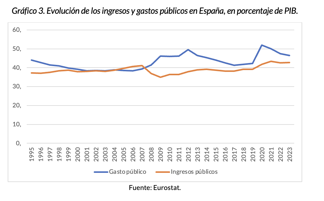 El informe recalca que "los ingresos de las Administraciones Públicas han subido con fuerza durante los últimos quince años. De 2019 a 2023, bajo gobierno de Pedro Sánchez, España es el tercer país que más ha incrementado los ingresos públicos, elevándolos en 3,6 puntos del PIB mientras la Unión Europea los reducía, en promedio, en 0,3 puntos. En 2024, de hecho, los ingresos tributarios obtenidos de enero a septiembre fueron superiores a la rúbrica recabada en todo el año 2018, cuando Sánchez llegó a la presidencia. Con todo, y pese a una subida tan acusada en los ingresos del Estado, la estabilidad presupuestaria sigue brillando por su ausencia, lo que pone de manifiesto que el problema de fondo nunca ha sido la insuficiencia de ingresos, sino el gasto excesivo".