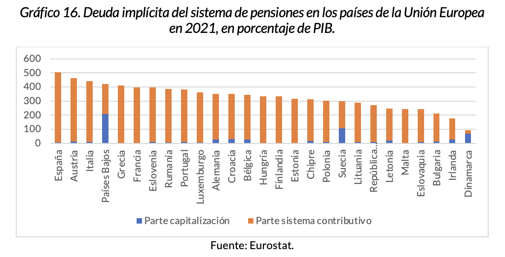 El informe del IJM encuentra que "la deuda implícita del sistema de pensiones asciende, según las previsiones de Bruselas, al 507 por ciento del PIB. Somos, por tanto, el país de la UE que ha formulado un mayor volumen de promesas a sus futuros pensionistas. Sin embargo, parece harto complicado que España cumpla estas promesas, puesto que el 99 por ciento de estos compromisos carecen de ahorro como respaldo".