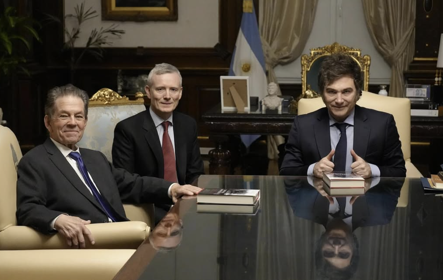 Laffer, que entregó a Milei una copia de su libro Los impuestos tienen consecuencias, apuntó durante su visita al país que "conforme Argentina tenga una moneda más sólida, seguiremos viendo cómo las tasas de inflación disminuyen de forma sustancial". En su opinión, "tanto el presidente como su gobierno entienden bien los retos que enfrenta Argentina".