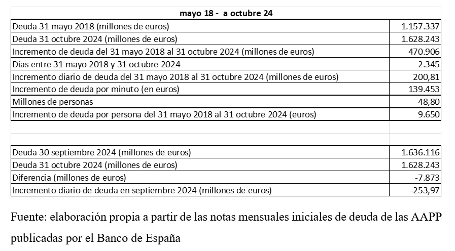 La deuda supera los 1,6 billones de euros y se sitúa en octubre en 1,628243 billones de euros de endeudamiento, con 470.000 millones de euros de incremento desde que gobierna Sánchez (470.906 millones), según las notas iniciales de deuda de las AAPP emitidas por el Banco de España con carácter mensual.