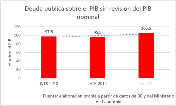 …sin esa revisión, sería del 105,5% del PIB. Es decir, la revisión extraordinaria del PIB rebaja en casi 3 puntos el cociente, pero la deuda sube con fuerza en valores absolutos: