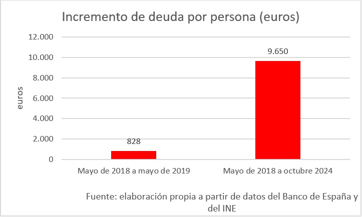 Así, si durante el primer año creció la deuda por persona en 828,03 euros, en los más de cuatro años de mandato de Sánchez la deuda por persona ha aumentado en 9.650 euros (más de diez veces el incremento del primer año).
