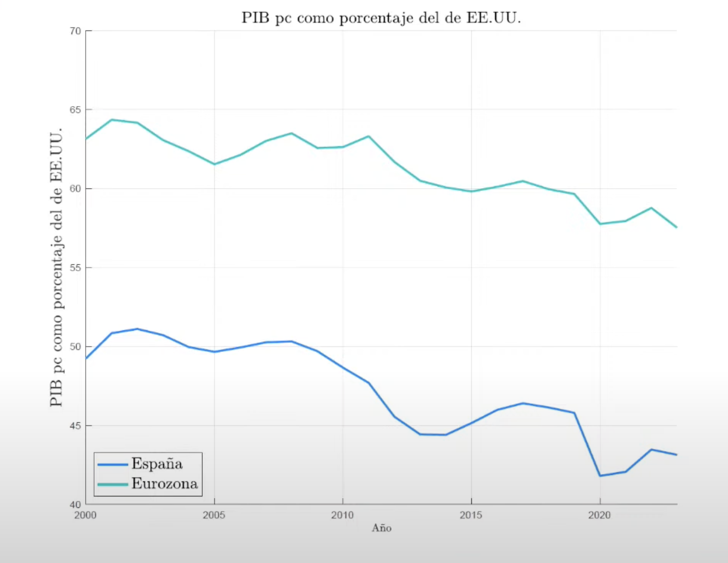 Sobre el estancamiento económico, criticó que "aunque España crezca, lo hace mucho menos de lo que debería si pretende recuperar todo el terreno perdido en relación con Europa y, sobre todo, con Estados Unidos". A continuación, exhibió el siguiente gráfico describiendo la creciente brecha de PIB per cápita entre España y el país norteamericano.