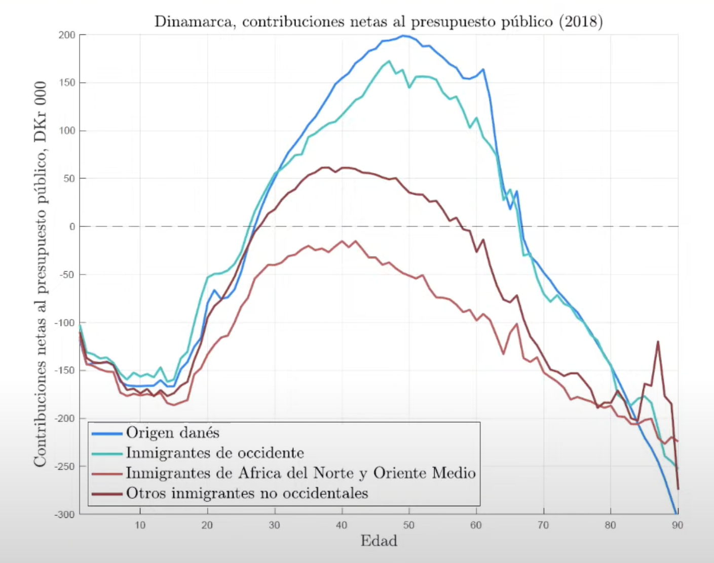 El académico tomó como referencia el siguiente gráfico, procedente de un estudio realizado en Dinamarca: "por edad, todos seguimos el mismo ciclo. De niños no aportamos nada al sistema porque no trabajamos y de viejos también tenemos un saldo negativo porque percibimos pensiones. A lo largo de una vida, el saldo neto del danés es más o menos cero. Si se hace la misma simulación para un inmigrante alemán, su entrada sale un tanto deficitaria. Por muy alemán que sea, no tiene la misma red de contactos ni conoce del todo el país. En cambio, las líneas de los inmigrantes de Asia y, sobre todo de África, reflejan escenarios donde el erario público siempre sale a perder. Me apuesto lo que quieran a que importante inmigrantes de Oriente Medio o Norte de África siempre salimos a perder. Por tanto, no solucionamos el problema sino que lo agravamos".