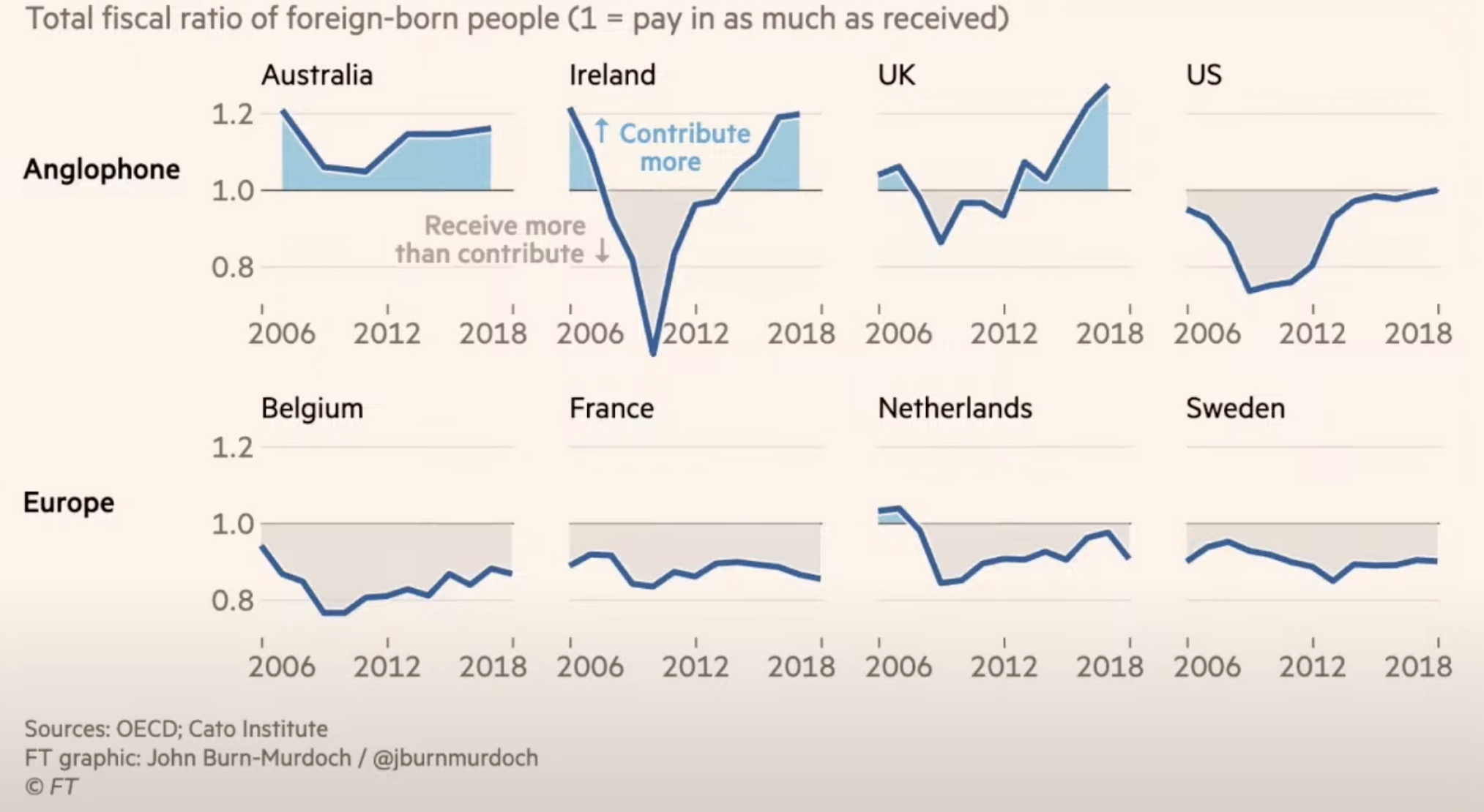 "En España, estos datos no los tenemos, pero podríamos generarlos si queremos. Otros cálculos disponibles que conviene revisar son, por ejemplo, los que han realizado la OCDE y el Instituto Cato y que ha presentado John Burn-Murdoch en el Financial Times. Como vemos, la situación es la misma. En Bélgica, Francia, Países Bajos, Suecia… cada entrada de inmigrantes sale deficitaria. Solamente en los países anglosajones tienen un sistema que les funciona, porque su política de entradas está más orientada a personas más cualificadas", apuntó.