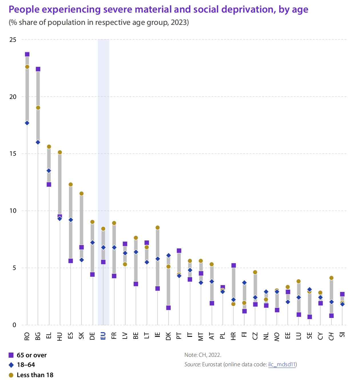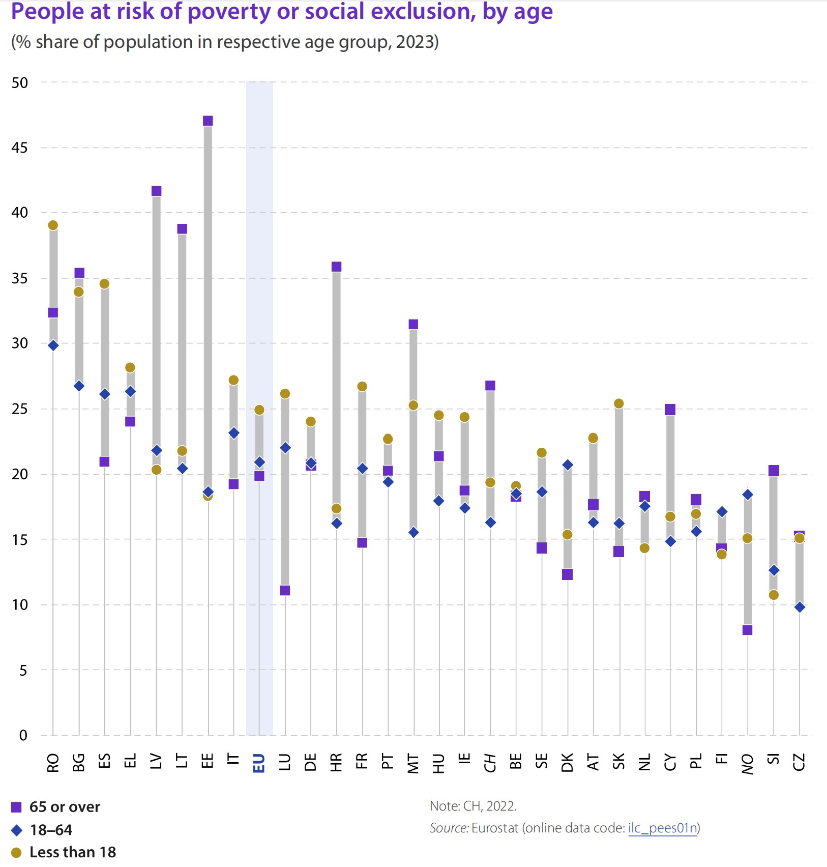 La primera imagen recoge el primer y principal gráfico del informe. Los países aparecen ordenados en función del porcentaje de sus habitantes "en riesgo de pobreza y exclusión social" y de su edad. El primero (o último, según se mire) en esta desgraciada lista es Rumanía y junto a este país, Bulgaria. En los dos casos, hablamos de entre un 25% y un 40% de riesgo de pobreza para los tres grandes grupos de población que se recogen en el estudio: menores de 18, adultos (entre 18 y 65) y jubilados (más de 65 años).