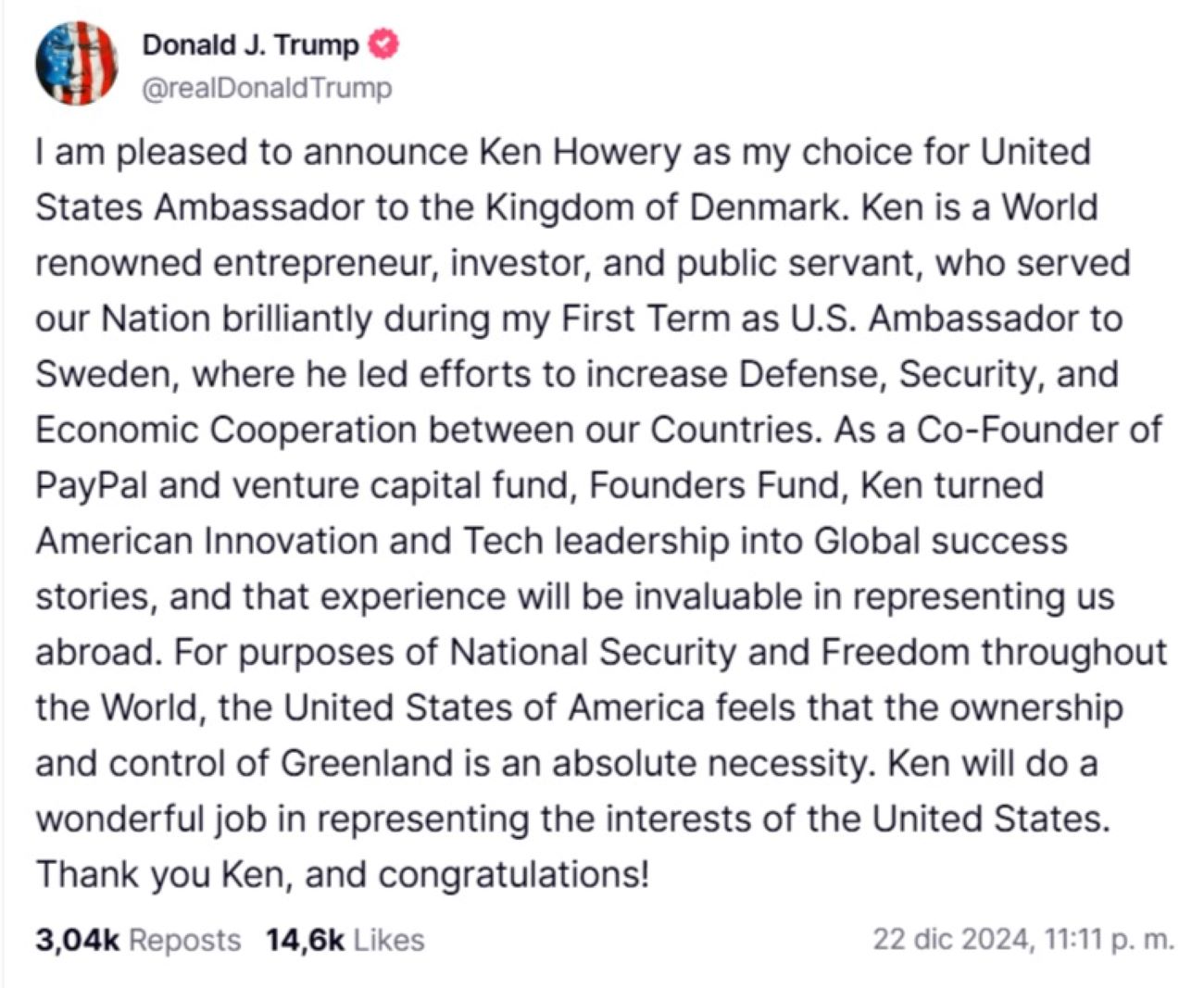 El presidente electo de EEUU, Donald Trump, ha aprovechado el nombramiento del nuevo embajador en Dinamarca, Ken Howery, para apuntar que es "una necesidad absoluta" para el país el control de Groenlandia. En concreto, ha escrito en su perfil oficial de Truth Social que "por motivos de seguridad nacional y libertad en todo el mundo, Estados Unidos considera que la propiedad y el control de Groenlandia son una necesidad absoluta".