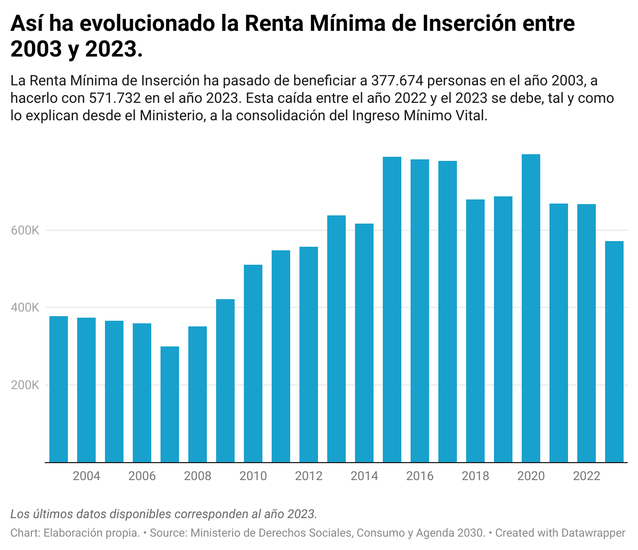 Para empezar, vamos a observar los datos pertenecientes a la Renta Mínima de Inserción en España, que desde el año 2003 hasta el año 2023 (últimos datos disponibles) ha tenido esta evolución: