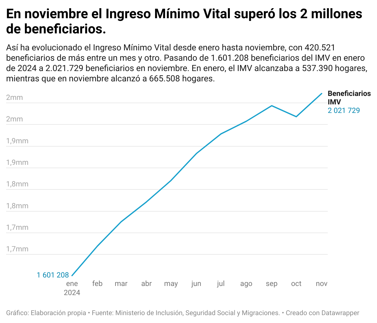 Como podemos ver, el número de beneficiarios del Ingreso Mínimo Vital en España no ha hecho más que crecer en todo el año 2024, a excepción de lo ocurrido entre septiembre y octubre donde hubo 25.407 beneficiarios menos. En enero había 1,6 millones de personas que se beneficiaban del IMV en España, mientras que en noviembre se ha superado la cifra de 2 millones de personas beneficiarias del Ingreso Mínimo Vital, alcanzando un récord de 2.021.729 personas. En cuanto al número de hogares a los que ha alcanzado el IMV, se ha pasado de 537.390 a 665.508 hogares.