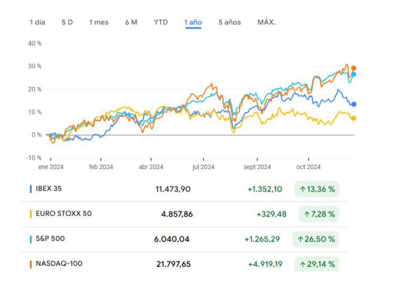 Una rentabilidad del 13% en el IBEX 35 o del 26% en el SP 500 no hacen más que confirmar el gran año que llevan las bolsas mundiales, que incluso la maltrecha economía europea ha hecho que sus inversores que invirtieron en el Eurostoxx 50 se hayan llevado un 7% en bolsa.