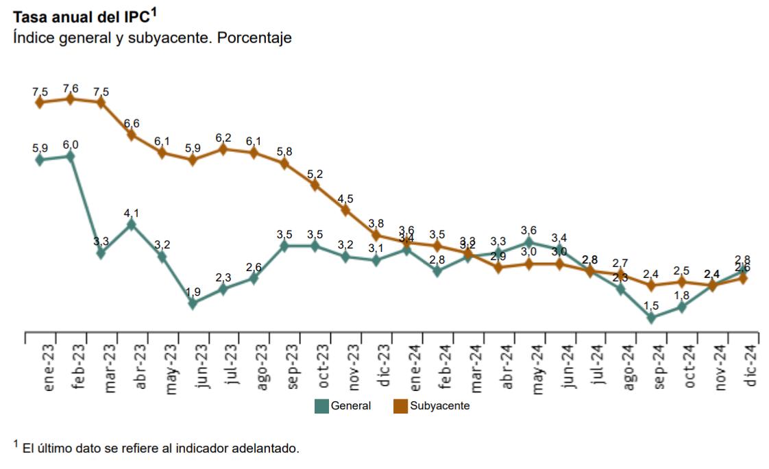 Por su parte, la tasa anual del indicador adelantado de la inflación subyacente aumenta dos décimas, hasta el 2,6%, mientras que la del IPC armonizado ha sido del 2,8%. Así, el INE detalla que "esta evolución es debida, principalmente, al aumento de los precios de los carburantes, frente a la bajada de diciembre de 2023". Del mismo modo, apunta que "aunque en menor medida, a los precios de ocio y cultura, que suben más que en el mismo mes del año anterior".