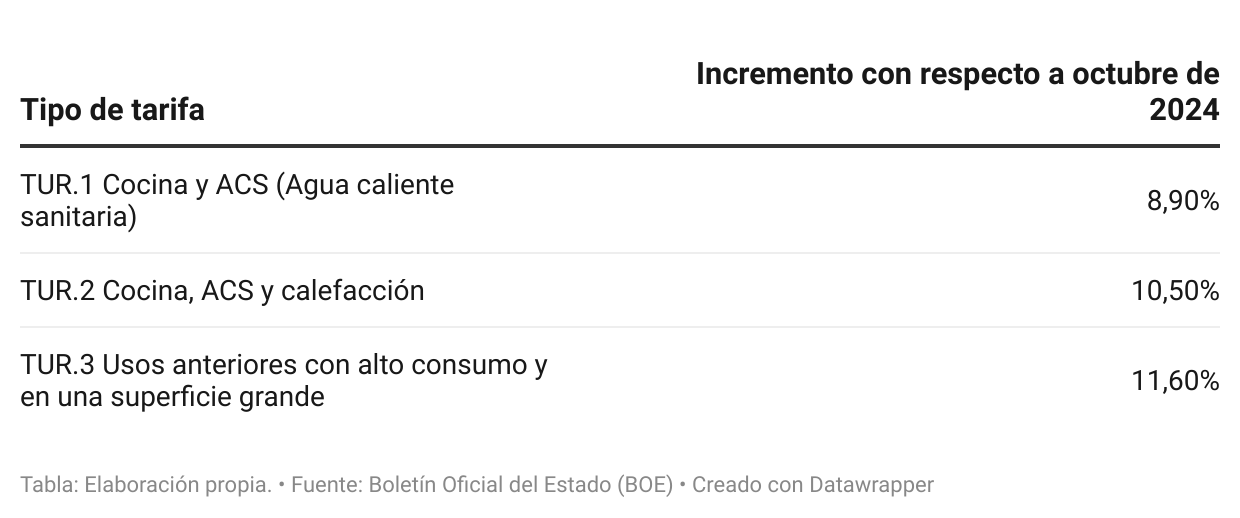 Como se puede ver en la tabla, para el tipo de tarifa más básica la subida sería de un 8,9% en comparación con la tarifa de octubre de 2024, esta primera tarifa tan sólo incluiría potencia suficiente como para hacer uso de la cocina y del agua caliente sanitaria (ACS). En cuanto a la segunda tarifa individual, que se compone de cocina, ACS y calefacción, el incremento con respecto a octubre de 2024 sería del 10,5%. Por último, para el nivel más alto de tarifa individual, que incluiría los tres usos anteriores y en una superficie grande (generalmente contratado por pymes), el incremento en el precio sería del 11,6%.