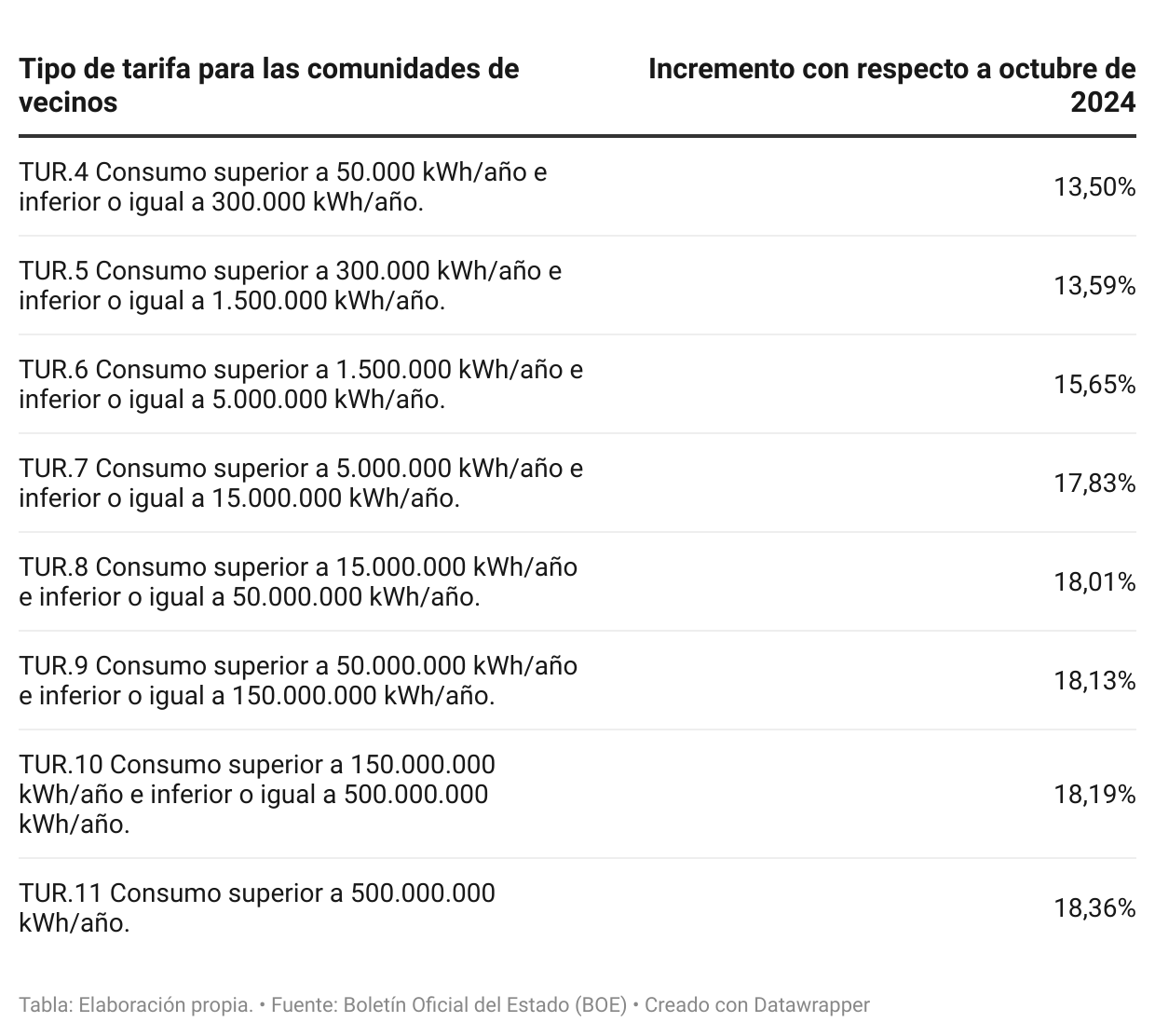 Tal y como se puede observar en la tabla, las subidas de precios varían entre el 13,5% de subida para el tipo de tarifa más básica o de menor potencia, hasta el 18,36% de incremento con respecto a octubre de 2024 de la tarifa vecinal de mayor consumo de kWh. Por lo que, a mayor consumo o potencia contratada, mayor es la subida que soportarán quienes hayan contratado dicho servicio.