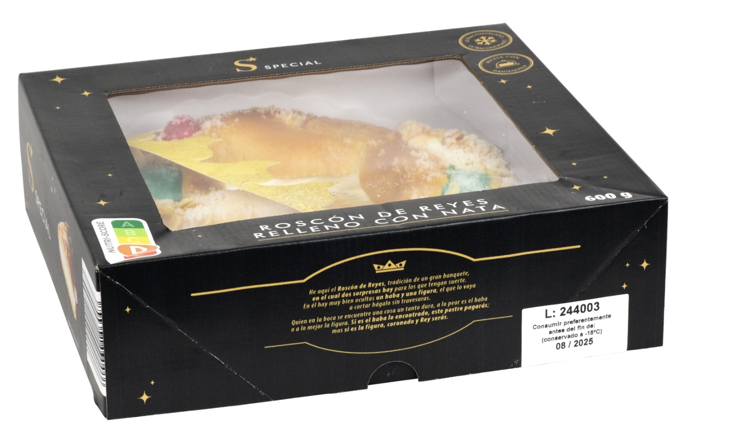 Esta opción de roscón de Reyes relleno de nata cuenta con 800 gramos y un 50% de relleno. Ha obtenido 5 estrellas en las categorías de “calidad de la grasa del bollo” y “calidad del relleno” por la OCU.