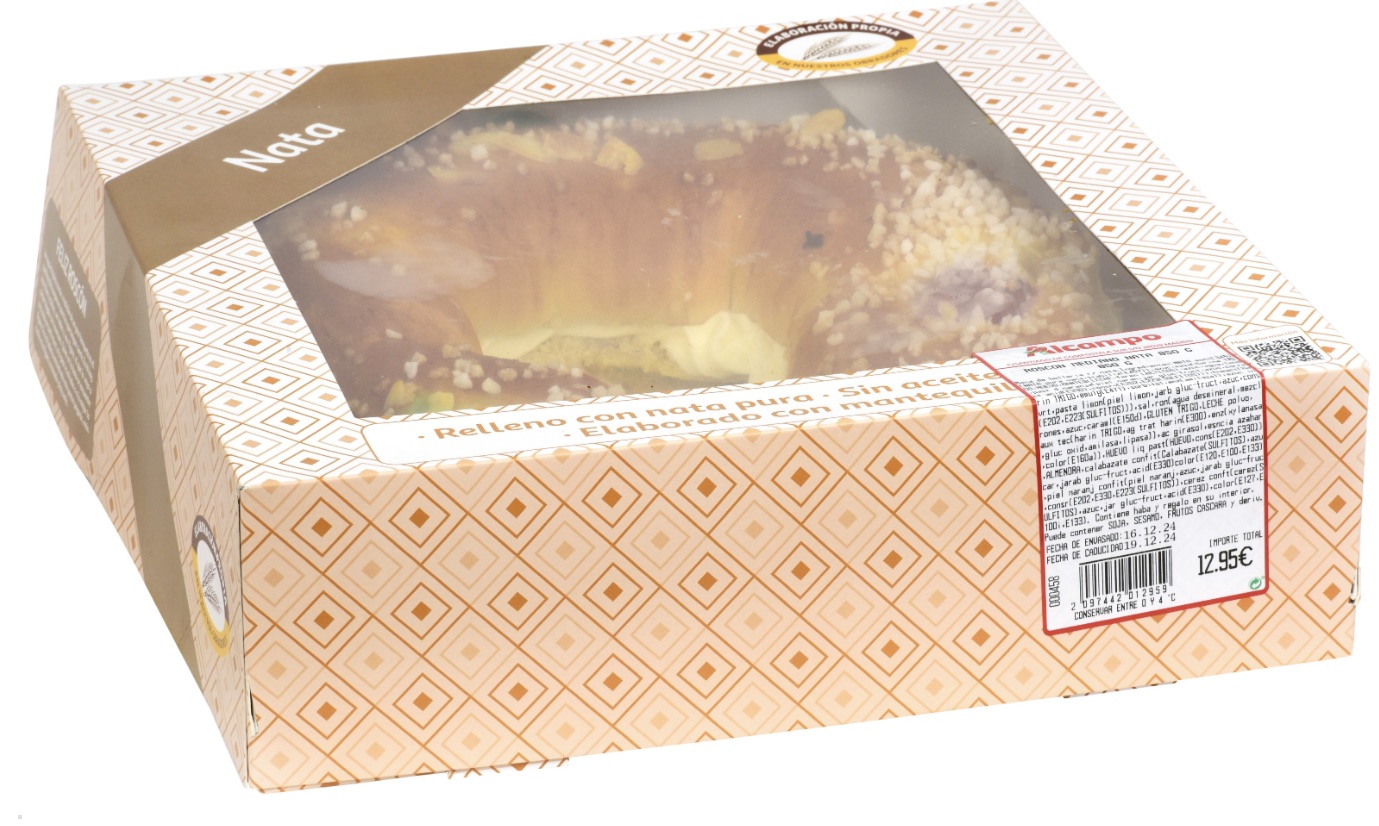 Con una calidad media según la OCU, esta opción de roscón de Reyes relleno de nata destaca por una buena calidad tanto del relleno como en la grasa del bollo.