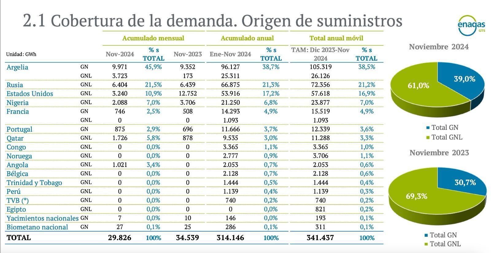 Los datos son los oficiales y están plasmados en el boletín estadístico de Enagas, el gestor del gas, de noviembre de 2024. Tan sólo falta el mes de diciembre, pero aún sus datos, a estas fechas, no han sido publicados. Y la fotografía es dura de digerir.