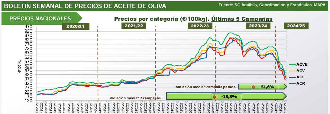 La tendencia es similar en con el precio de origen de los principales mercados, donde el aceite de oliva ha comenzado el año con una caída del precio del 50% con respecto a la campaña anterior y de más del 40% en comparación con el inicio de la actual cosecha, según las cotizaciones de Jaén, Córdoba y Tarragona recogidas por el Ministerio de Agricultura.