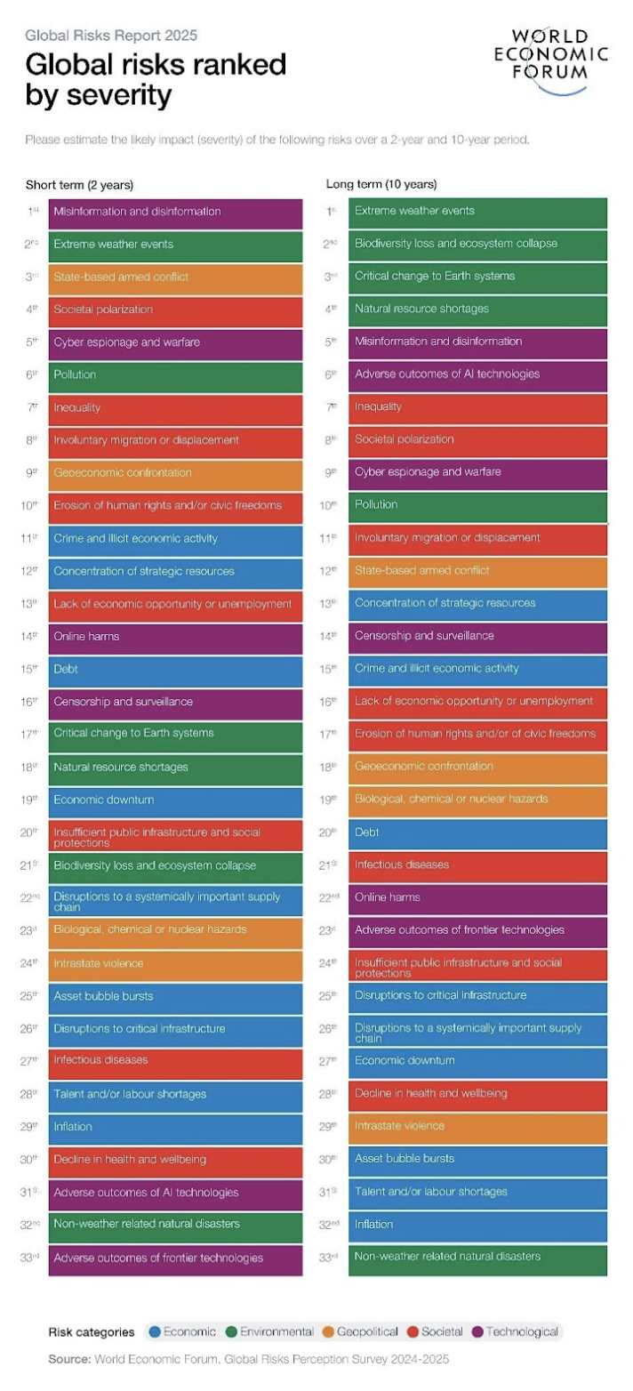Desde hace años, el Foro de Davos viene realizando un "Informe de Riesgos Globales" que estaría basado en una serie de encuestas que realizan a más de 900 "expertos" para definir cuáles son los problemas de mayor gravedad a los que se enfrentará el mundo en el corto y largo plazo. Este informe cumple en 2025 su 20ª edición, y las conclusiones a las que ha llegado no dejarán indiferente a nadie.