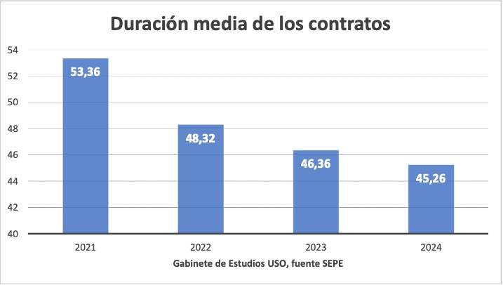 Lo cierto es que "el porcentaje de los contratos temporales de corta duración aumenta en 2024, con respecto a 2021. Un 59,3% de los contratos temporales que se realizan tienen una duración media inferior a un mes (casi dos de cada tres), frente al 39,8% que se producía en 2021", añade el informe.
