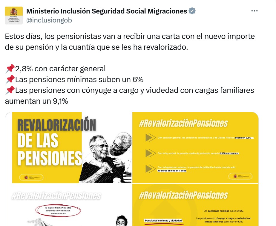 Desde el Ejecutivo no aclaran qué pasará con las pensiones en marzo, aunque todo apunta a que acabarán revalorizándolas con un decreto ley, y que el plan de dejar a los pensionistas sin actualización en febrero no es más que una estrategia política para intentar castigar a Junts y PP por votar en contra culpándoles de no actualizarlas. De hecho, la propia ministra de Seguridad Social ha publicado en X lo que dejará de cobrar al año cada pensionista por CCAA, pero solo "por culpa de la irresponsabilidad del PP".