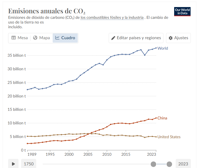 Como se puede comprobar, China lleva una línea creciente en emisiones de CO2 desde antes del año 1995, mientras que Estados Unidos llevaría reduciendo sus emisiones desde el año 2007 aproximadamente. Es decir, mientras Estados Unidos ha pasado de representar el 23% de todas las emisiones mundiales de CO2 en el año 1989 a representar actualmente el 13%, en el mismo tiempo China ha pasado de representar el 11% en 1989 a representar el 31,5% en 2023. Hoy China contamina más del doble que Estados Unidos.