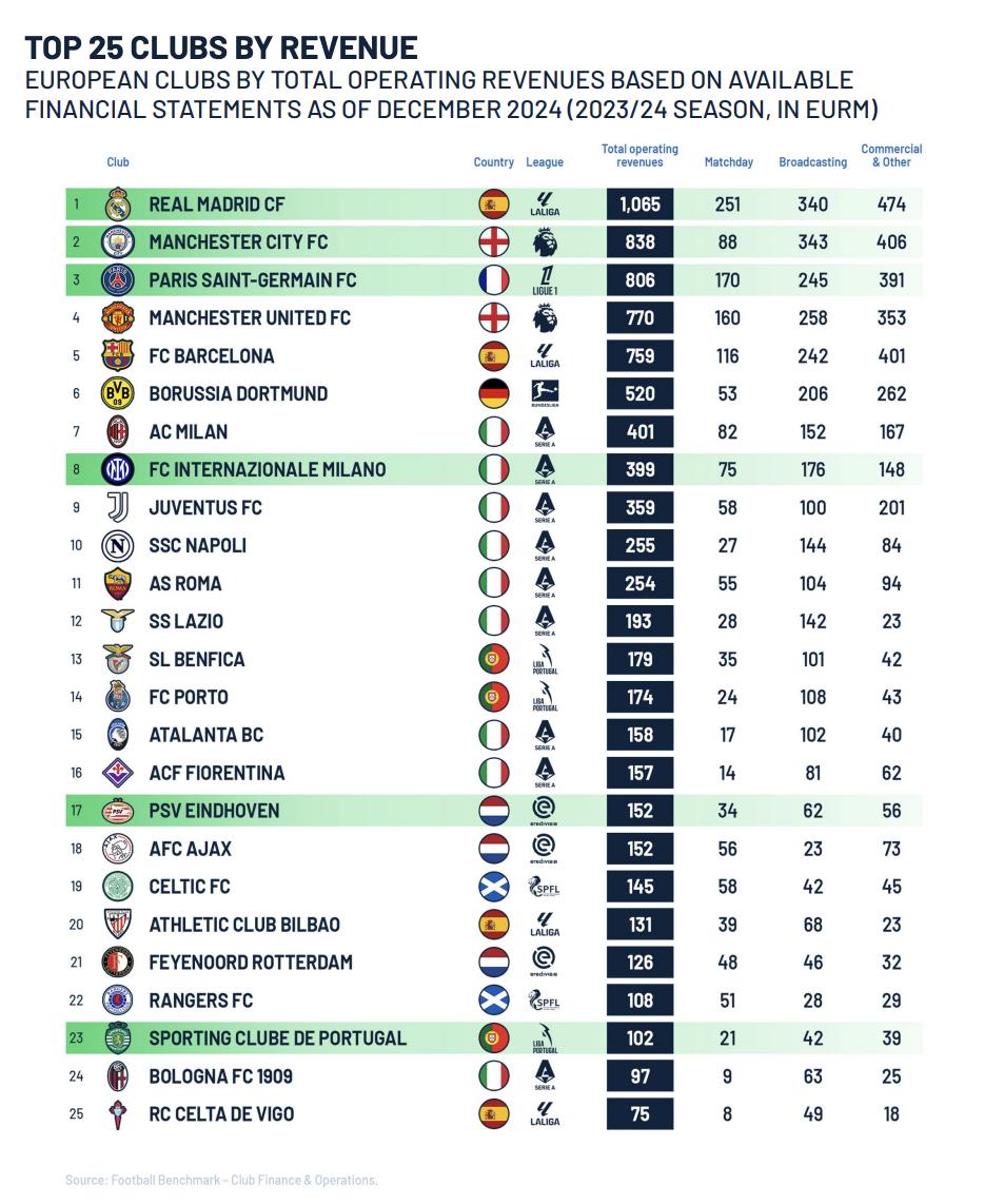A distancia de los anteriores equipos, nos topamos con el Borussia Dortmund (520 millones), el AC Milán (401 millones), el Inter de Milán (399 millones), la Juventus de Turín (359 millones) y el Nápoles (255 millones). Entre las 25 primeras posiciones del ranking figuran asimismo el Athletic Club de Bilbao, con 131 millones, y el RC Celta de Vigo, con 75 millones. El estudio cubre el grueso de la élite futbolística europea, aunque no recoge datos del Atlético de Madrid o el Bayern de Múnich, entre otros.