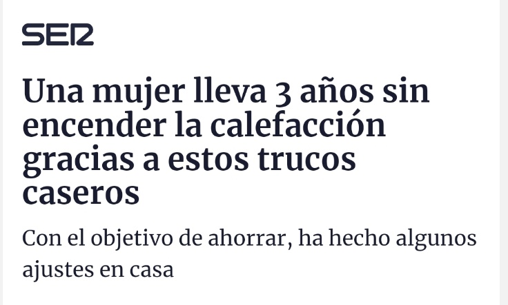 Sin embargo, ahora en la cadena de Prisa, publican artículos como este, donde nos cuentan los "trucos caseros" para ahorrar en la factura de la luz de una periodista británica llamada Catherine Renton. La Ser ensalza que esta mujer "comenzó a ir mucho más abrigada en casa, poniéndose más capas de ropa y usar mantas para resguardarse del frío, pero también buscó otras fuentes de calor para caldear las estancias de su casa."